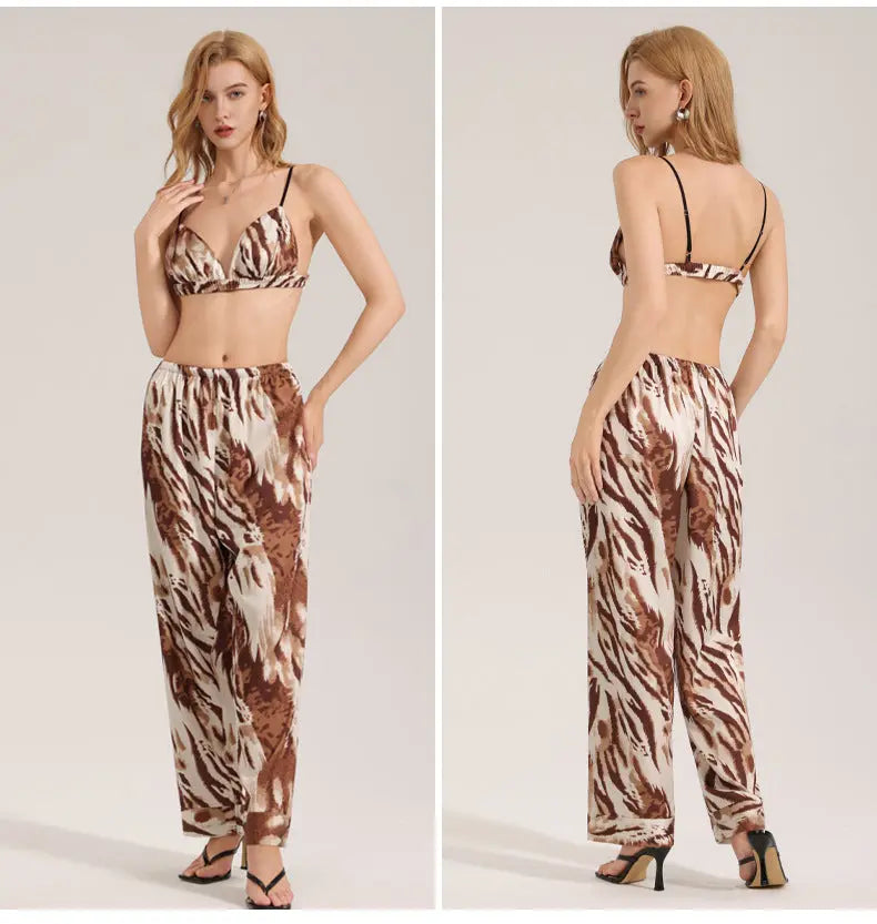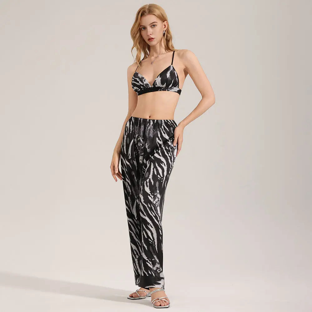 Experience ultimate comfort with our zebra-print pajamas, crafted from high-quality satin chiffon. This luxurious fabric is lightweight and breathable, making it perfect for hot summer nights. The soft texture feels gentle against the skin, ensuring that you feel relaxed whether you're lounging at home or enjoying a cozy night in. The elegant zebra print also adds a touch of flair to your sleepwear collection, combining visual appeal with functional design. Whether you're looking for a casual outfit to relax in or a stylish set to wear while waking up in the morning, our zebra-print pajamas meet your needs effortlessly.